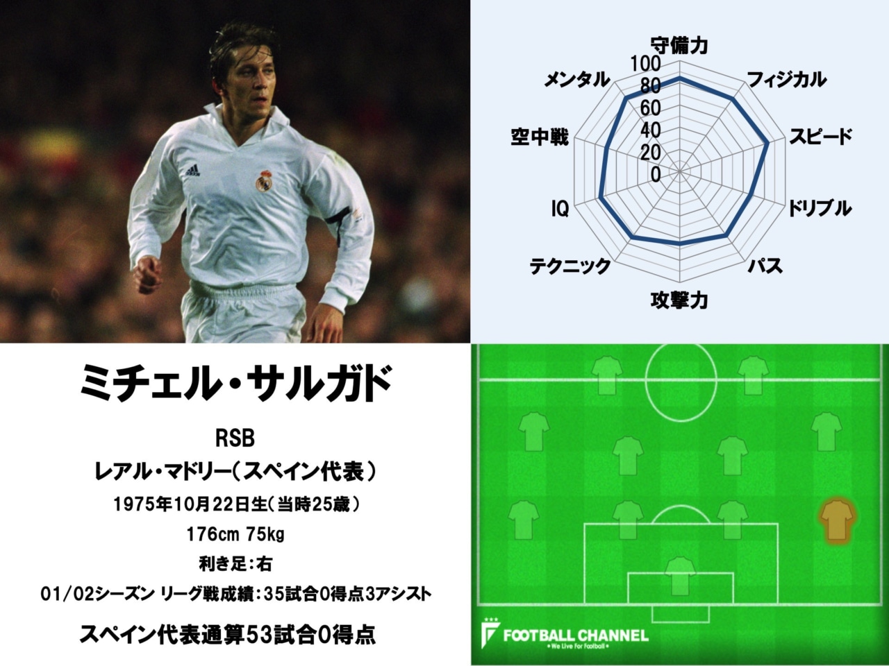 能力値を見ると、左サイドのロベルト・カルロスとは異なり「守備力」が最高評価となっている。そのほかにも「フィジカル」や「スピード」、「メンタル」で80を超える高い評価を受けている。