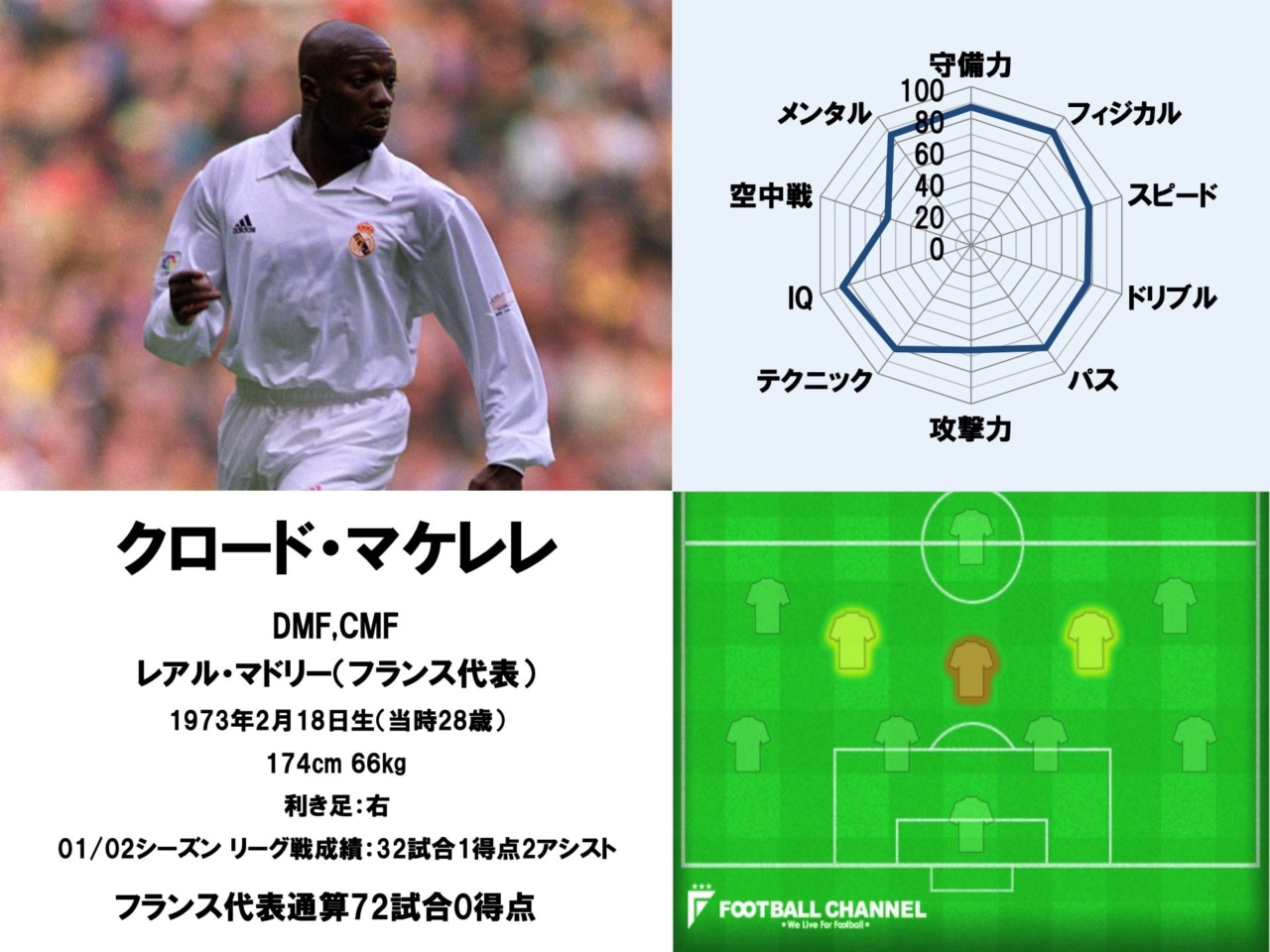 01/02シーズン、レアル・マドリードが欧州制覇を果たした最大の要因はマケレレの存在にあった。ジダン、フィーゴ、ソラーリといった攻撃的な選手が揃う中盤において守備的な役割を一手に担い、チームを頂点に導いた。