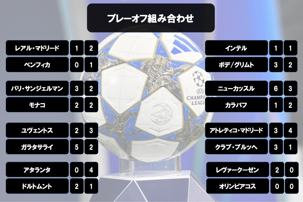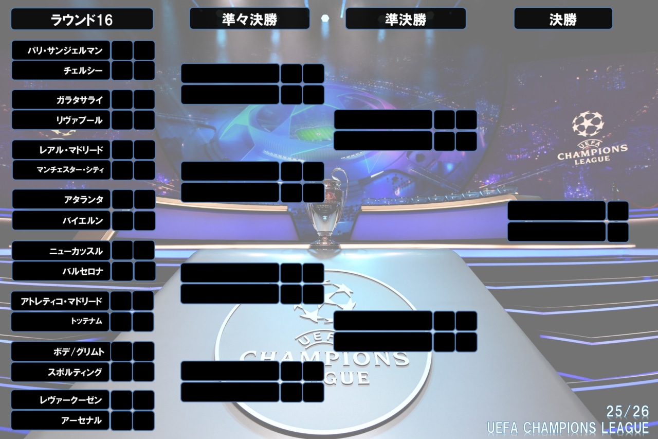 UEFAチャンピオンズリーグ2025/26(欧州CL)の決勝トーナメント表は下記の通り。リーグフェーズ9〜24位のチームがプレーオフを戦い、勝利した8チームがラウンド16でリーグフェーズ1〜8位のチームと対戦する。プレーオフ〜準決勝まではホーム&アウェイで行われ、決勝のみ一発勝負に。スコアが並んだ場合は15分ハーフの延長戦を実施。延長戦でも決着がつかない場合はPK戦に突入する。