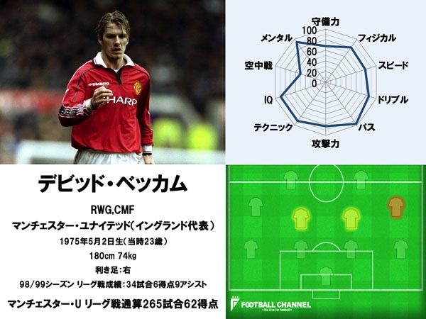 そのハリウッドスター顔負けのルックスが人気の理由だが、もちろんピッチ上でも世界有数の実力を誇っている。基本データの対象となっている98/99シーズンは、バイエルンとのCL決勝で後半アディショナルタイムにCKから逆転となる2得点を演出。その驚異的な右足の精度を世界中に見せつけた。