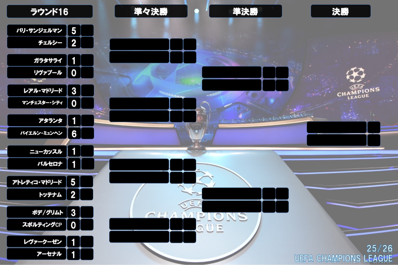 UEFAチャンピオンズリーグ2025/26(欧州CL)の決勝トーナメント表は下記の通り。リーグフェーズ9〜24位のチームがプレーオフを戦い、勝利した8チームがラウンド16でリーグフェーズ1〜8位のチームと対戦する。プレーオフ〜準決勝まではホーム&アウェイで行われ、決勝のみ一発勝負に。スコアが並んだ場合は15分ハーフの延長戦を実施。延長戦でも決着がつかない場合はPK戦に突入する。