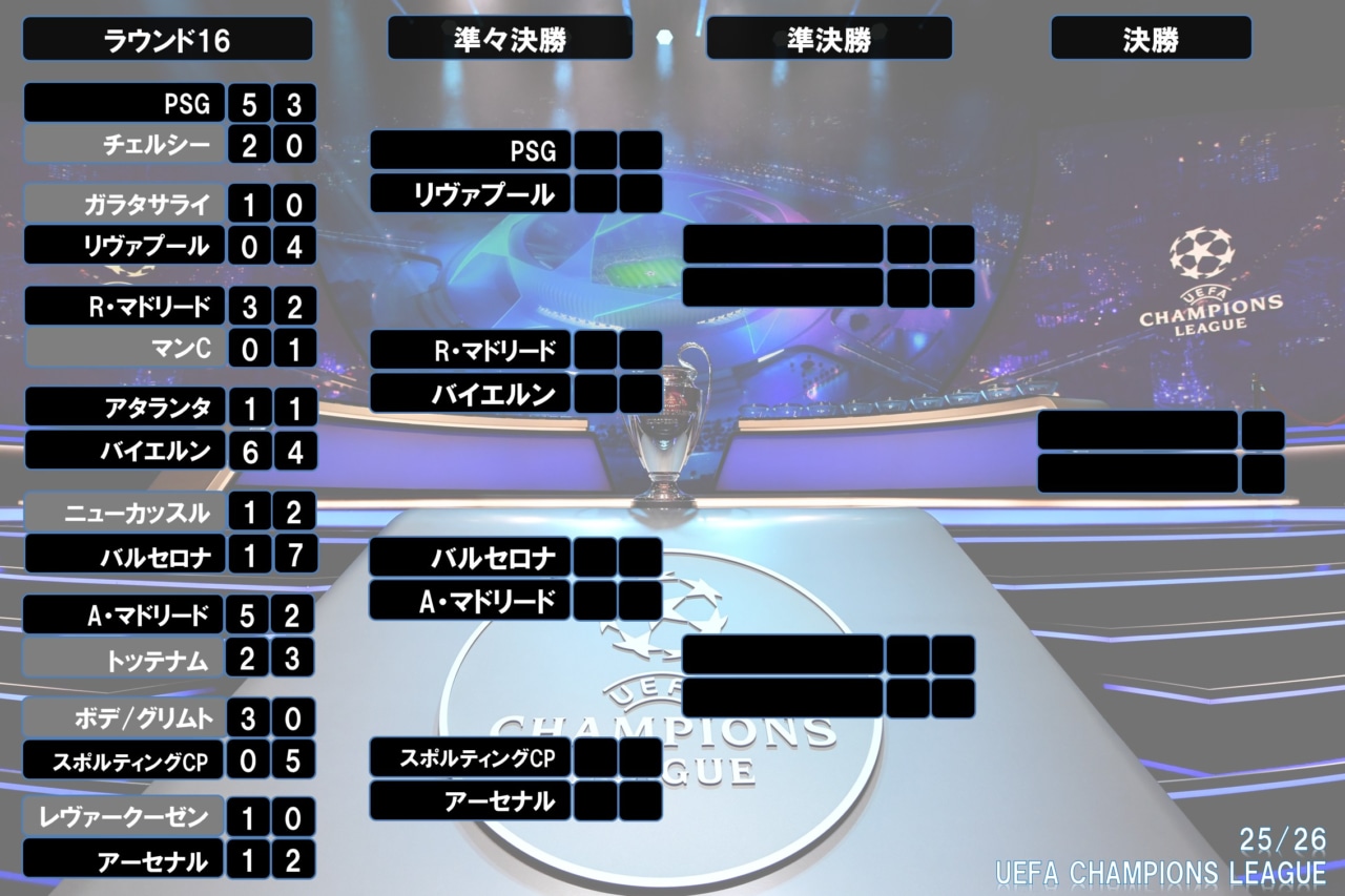 UEFAチャンピオンズリーグ2025/26(欧州CL)の決勝トーナメント表は下記の通り。リーグフェーズ9〜24位のチームがプレーオフを戦い、勝利した8チームがラウンド16でリーグフェーズ1〜8位のチームと対戦する。プレーオフ〜準決勝まではホーム&アウェイで行われ、決勝のみ一発勝負に。スコアが並んだ場合は15分ハーフの延長戦を実施。延長戦でも決着がつかない場合はPK戦に突入する。