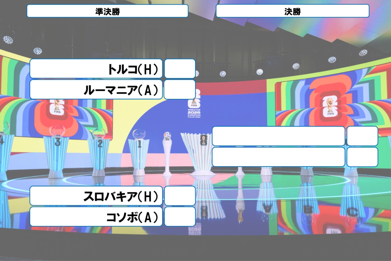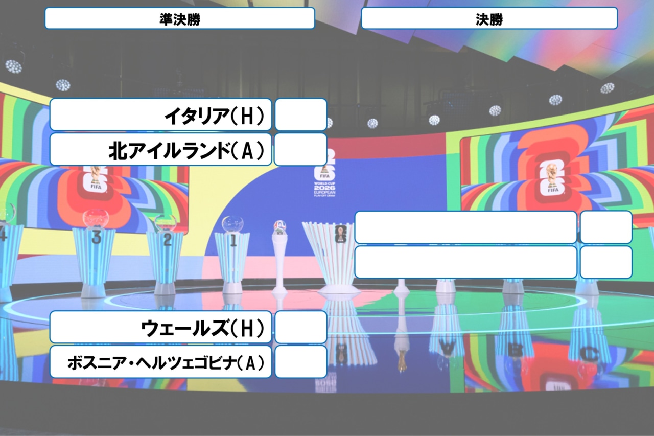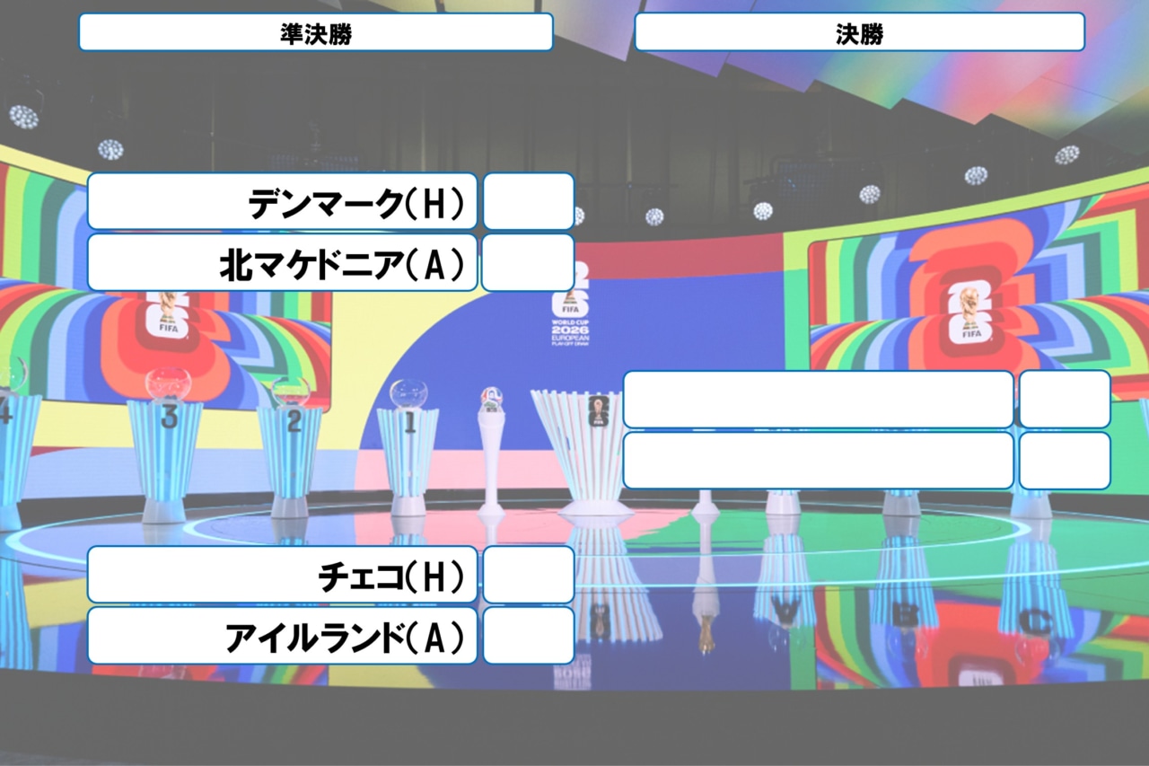 FIFAワールドカップ2026(欧州PO)のトーナメント表は以下の通り。試合はすべてシングルマッチで行われ、90分間で決着がつかない場合は15分ハーフの延長戦に突入。延長戦でも決着がつかない場合はPK戦で勝敗を決める。各パスを勝ち上がった合計4チームがW杯2026本戦への出場権を得る。