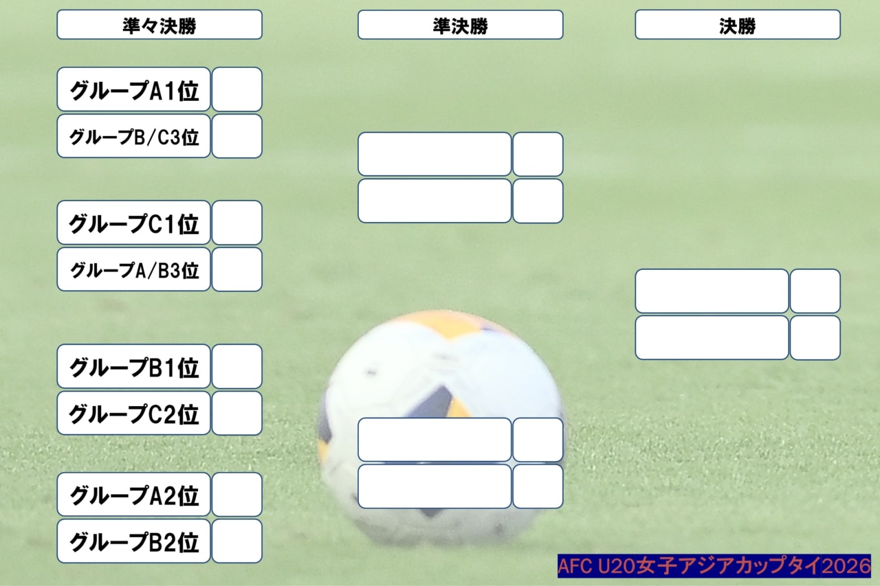 AFC U20女子アジアカップタイ2026(女子アジア杯)の決勝トーナメント表は下記の通り。90分間で決着がつかない場合は15分ハーフの延長戦を実施。延長戦でも決着がつかない場合はPK戦に突入する。