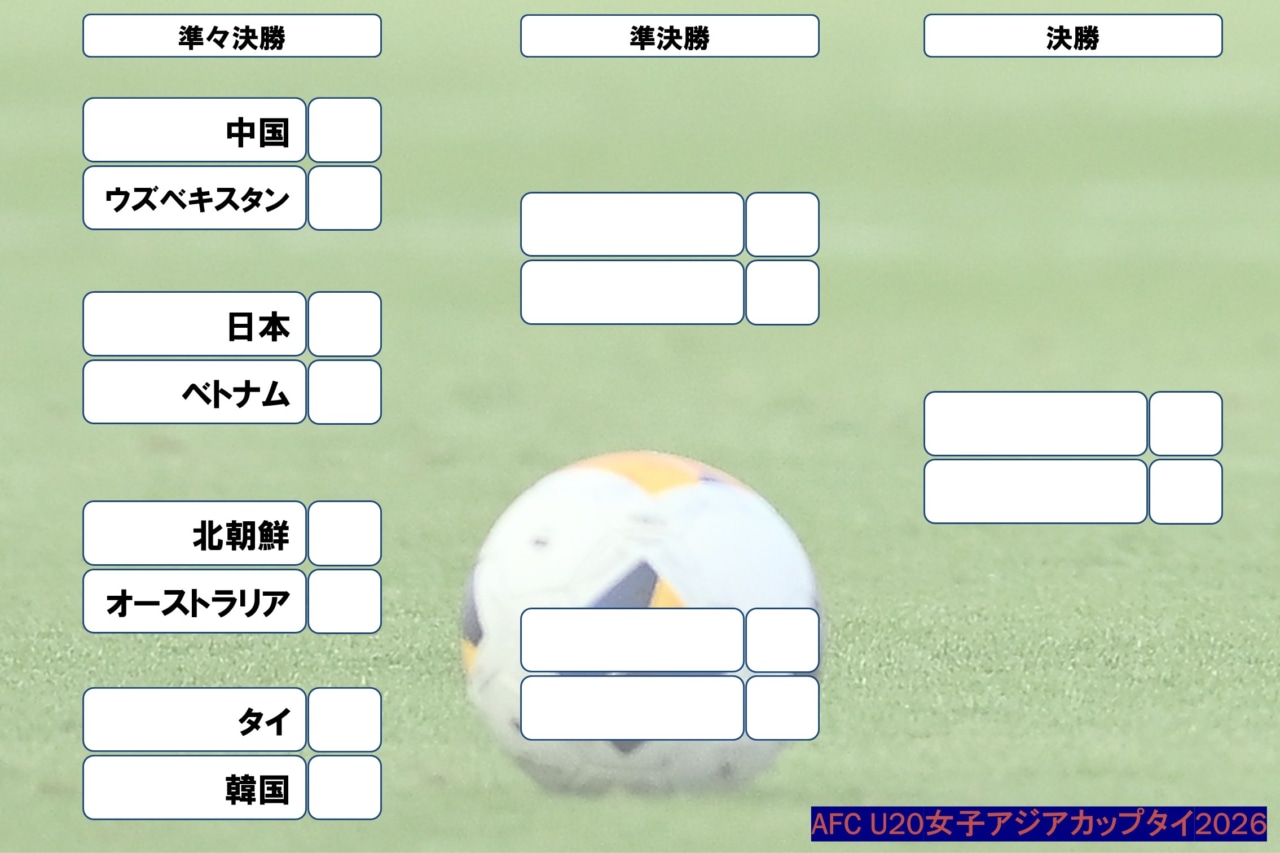 AFC U20女子アジアカップタイ2026(女子アジア杯)の決勝トーナメント表は下記の通り。90分間で決着がつかない場合は15分ハーフの延長戦を実施。延長戦でも決着がつかない場合はPK戦に突入する。