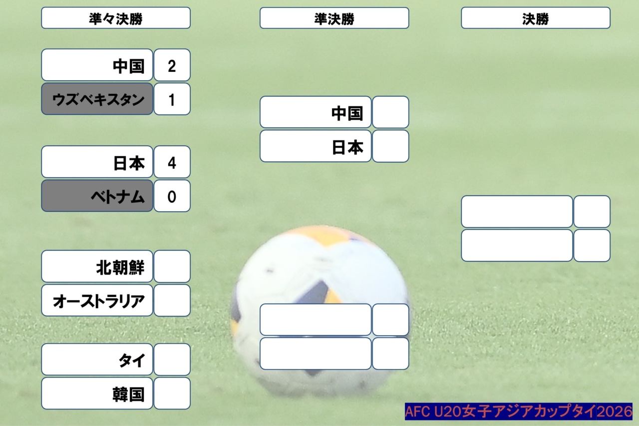 AFC U20女子アジアカップタイ2026(女子アジア杯)の決勝トーナメント表は下記の通り。90分間で決着がつかない場合は15分ハーフの延長戦を実施。延長戦でも決着がつかない場合はPK戦に突入する。