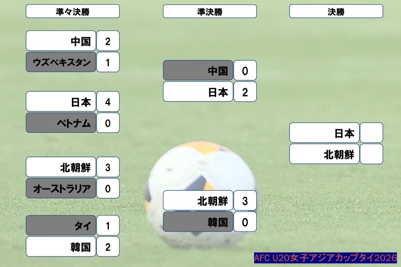 AFC U20女子アジアカップタイ2026(女子アジア杯)の決勝トーナメント表は下記の通り。90分間で決着がつかない場合は15分ハーフの延長戦を実施。延長戦でも決着がつかない場合はPK戦に突入する。