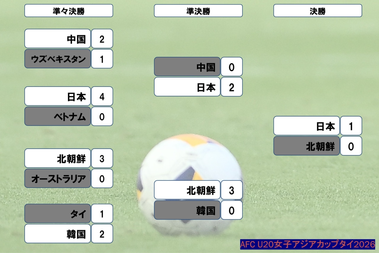 AFC U20女子アジアカップタイ2026(女子アジア杯)の決勝トーナメント表は下記の通り。90分間で決着がつかない場合は15分ハーフの延長戦を実施。延長戦でも決着がつかない場合はPK戦に突入する。
