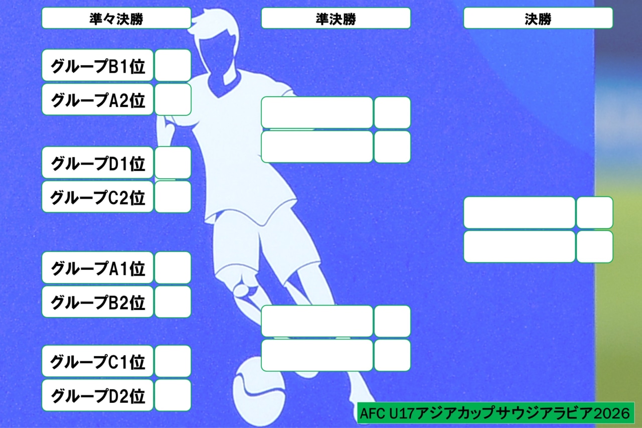 2026年5月6日(水・祝)~5月23日(土)にかけて行われるAFC U17アジアカップ サウジアラビア2026の決勝トーナメント表は以下の通り。90分間で決着がつかない場合は延長戦を行わず、PK戦で勝敗を決める。