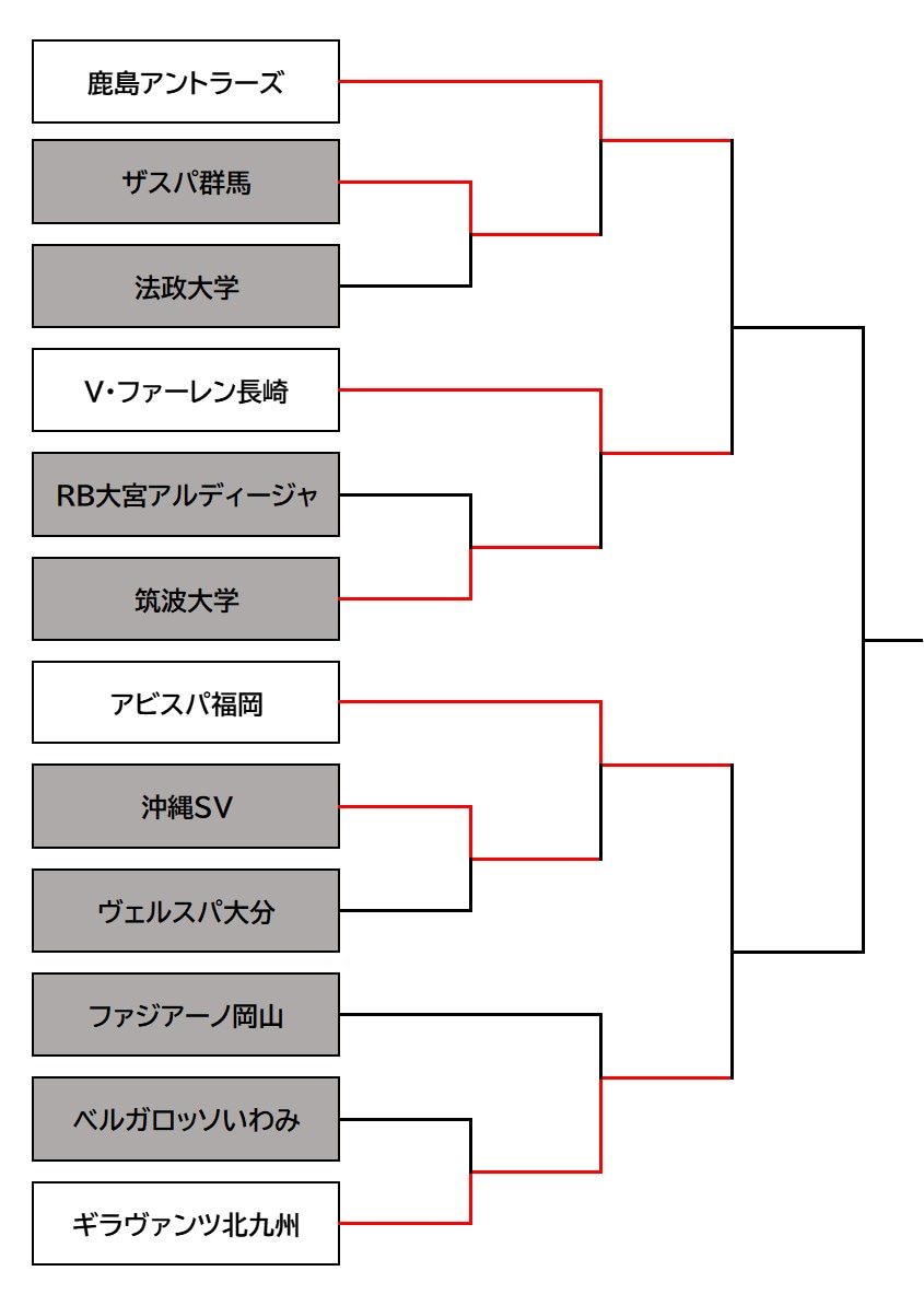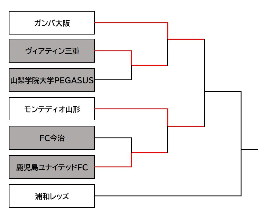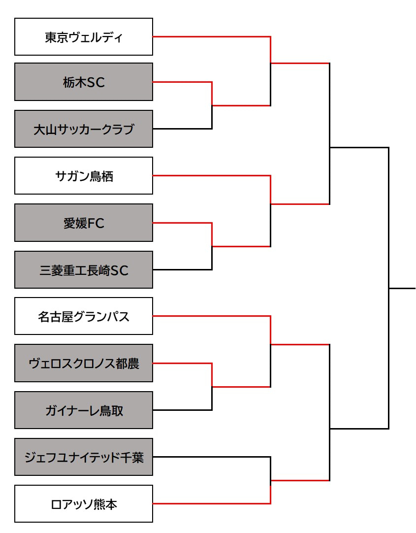 2回戦:1回戦を勝ち上がった27チームとJ1リーグを含む33チームが、1試合制のノックアウト方式を行う。