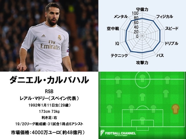 20/21サッカー選手能力値ランキング59位。DFダニエル・カルバハル(レアル・マドリード)
