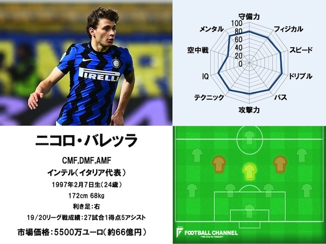 20/21サッカー選手能力値ランキング41位。MFニコロ・バレッラ(インテル)