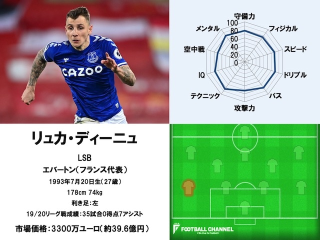 20/21サッカー選手能力値ランキング46位。DFリュカ・ディーニュ(エバートン)