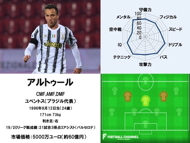 20/21サッカー選手能力値ランキング65位。MFアルトゥール(ユベントス)