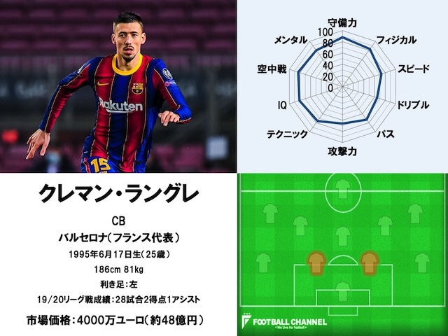 20/21サッカー選手能力値ランキング82位。DFクレマン・ラングレ(バルセロナ)