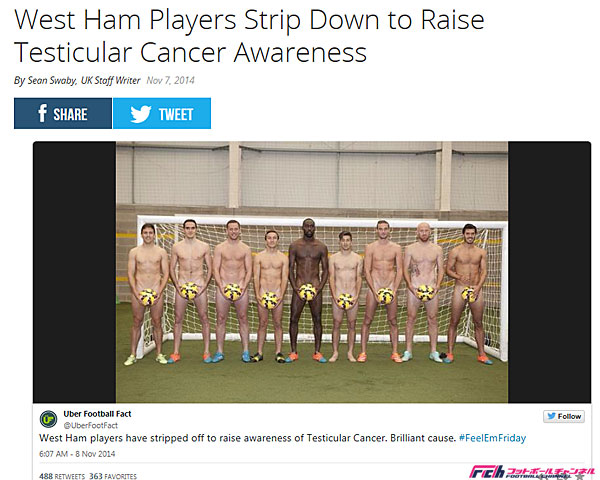裸で募金を呼びかけ! がん予防のキャンペーンでウェストハムの9選手がヌードを披露。4月に兄を亡くした選手も参加