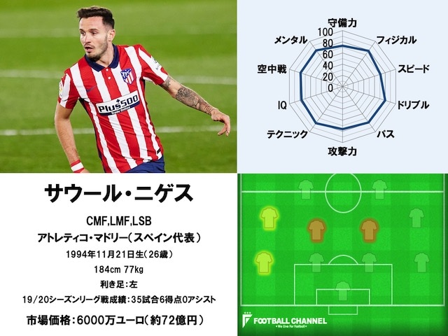 20/21サッカー選手能力値ランキング87位。MFサウール・ニゲス(アトレティコ・マドリード)