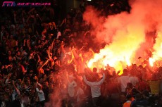 過激過ぎるガラタサライサポーター。燃え盛る発煙筒がピッチに投げ込まれ試合が一時中断、7人の逮捕者も